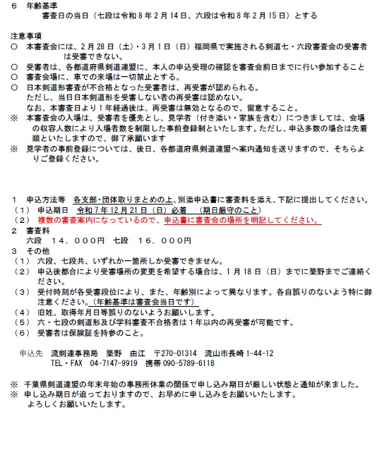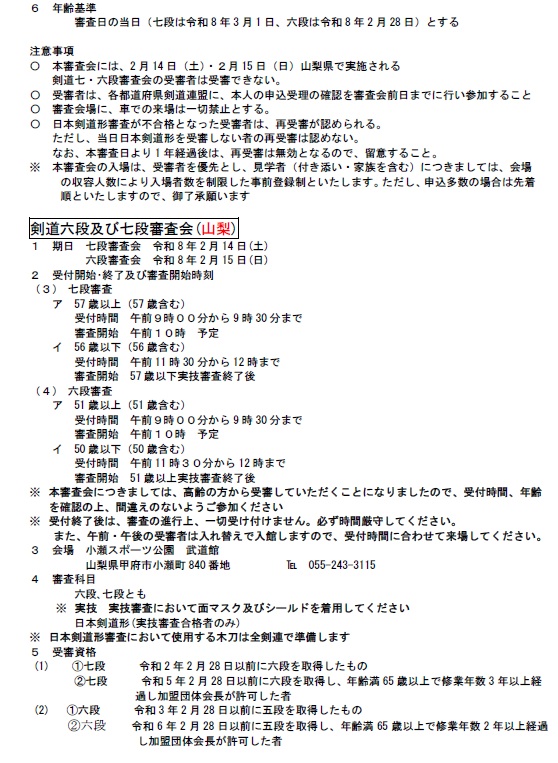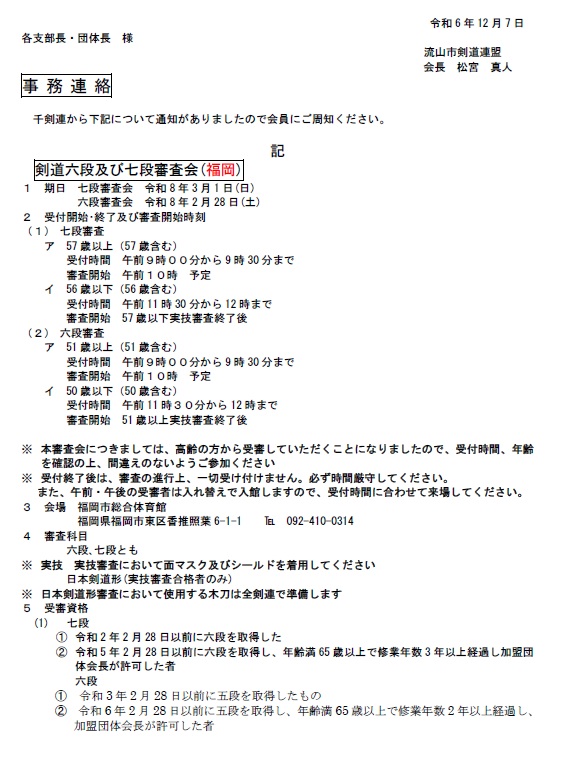 更新日:2025年12月09日 / 投稿日:2025年12月09日 剣道六・七段審査会の実施について(2,3月福岡・山梨) 標記について、 千剣連から以下のファイルのとおり実施の案内がありましたので、通知します。 以下により、申し込み願います。 要項等 この部分にclear:both;を設定しています 一覧にもどる 各支部のご紹介