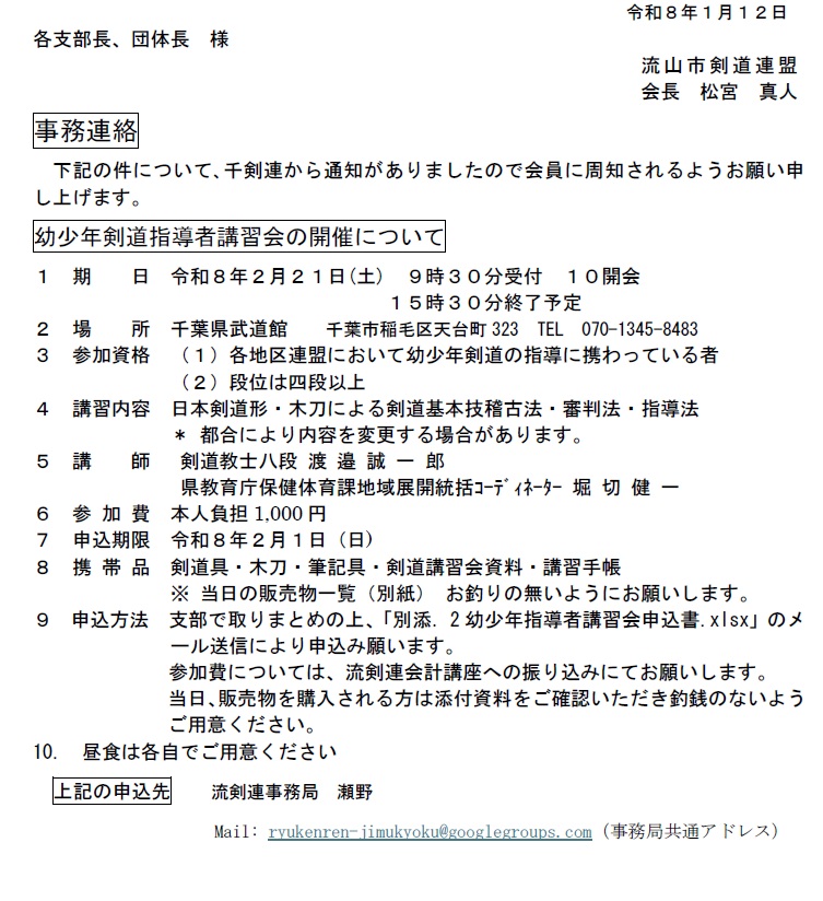 千剣連から以下のファイルのとおり実施の案内がありましたので、通知します。