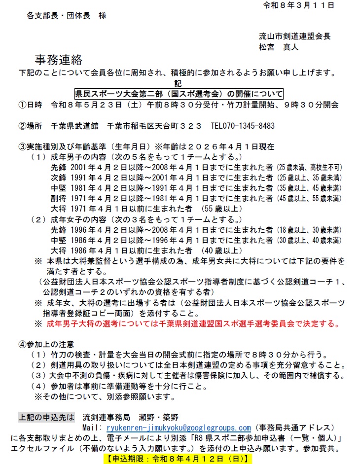 【千剣連】県民スポーツ大会第二部(国スポ選考会)の開催について