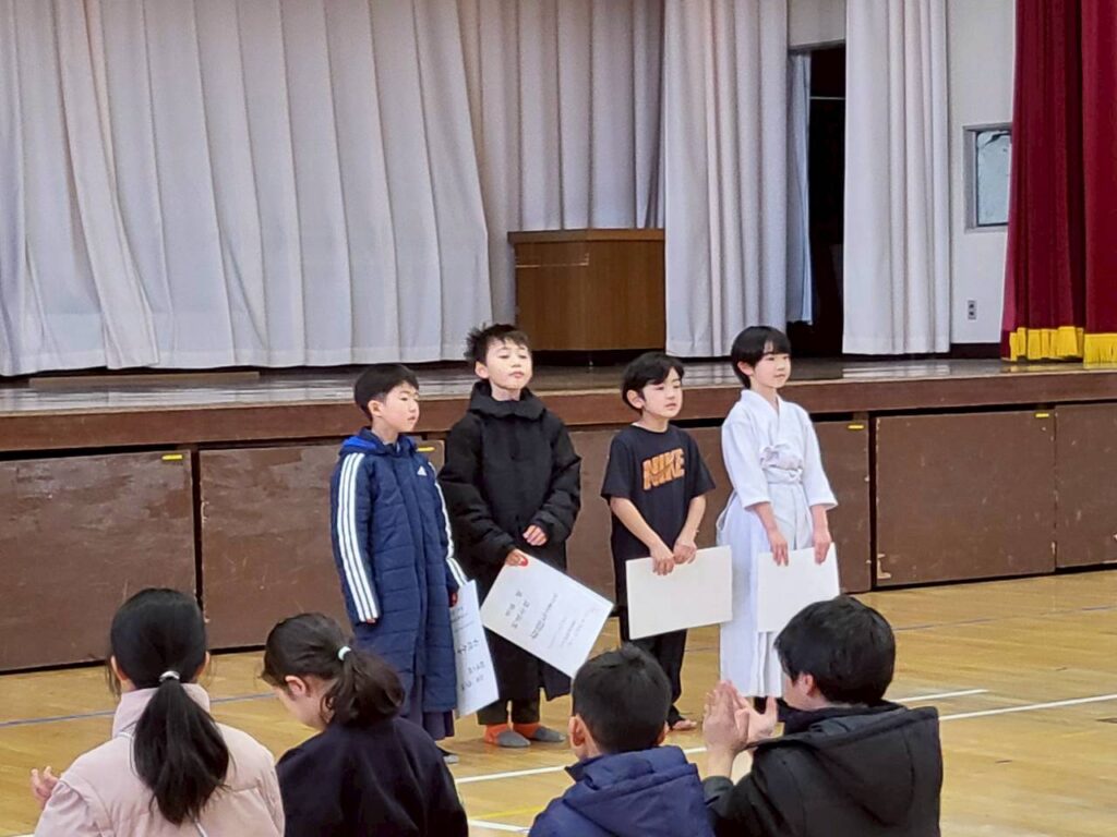 土手ランニング、ビンゴ大会、記念撮影、昇級審査免状と称号授与、支部長挨拶 など行いました。